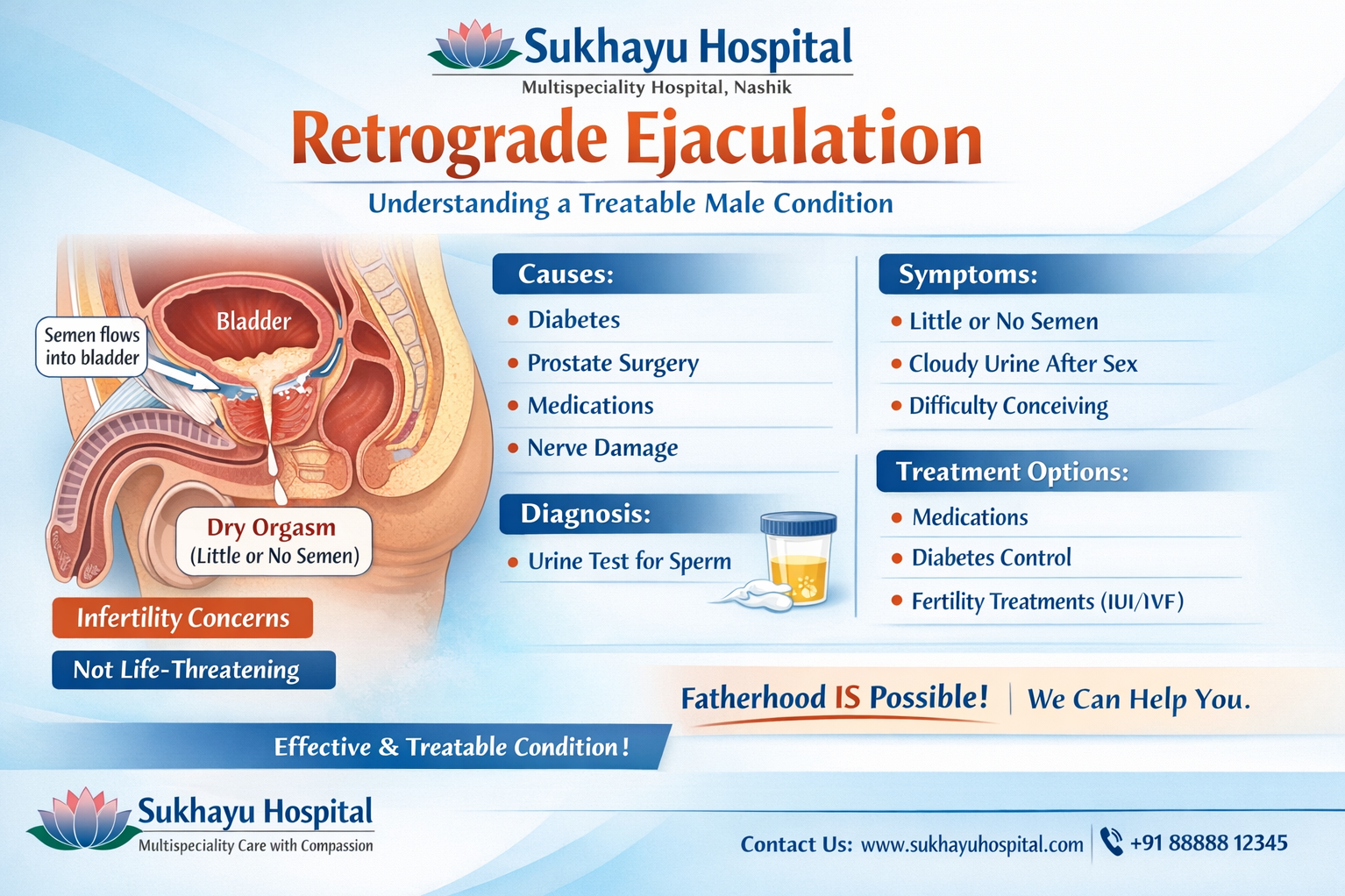 Sukhayu Hospital believes that accurate information is the first step toward effective treatment. Retrograde ejaculation is one such condition that causes anxiety in many men, especially those planning a family, but it is very much treatable in most cases.