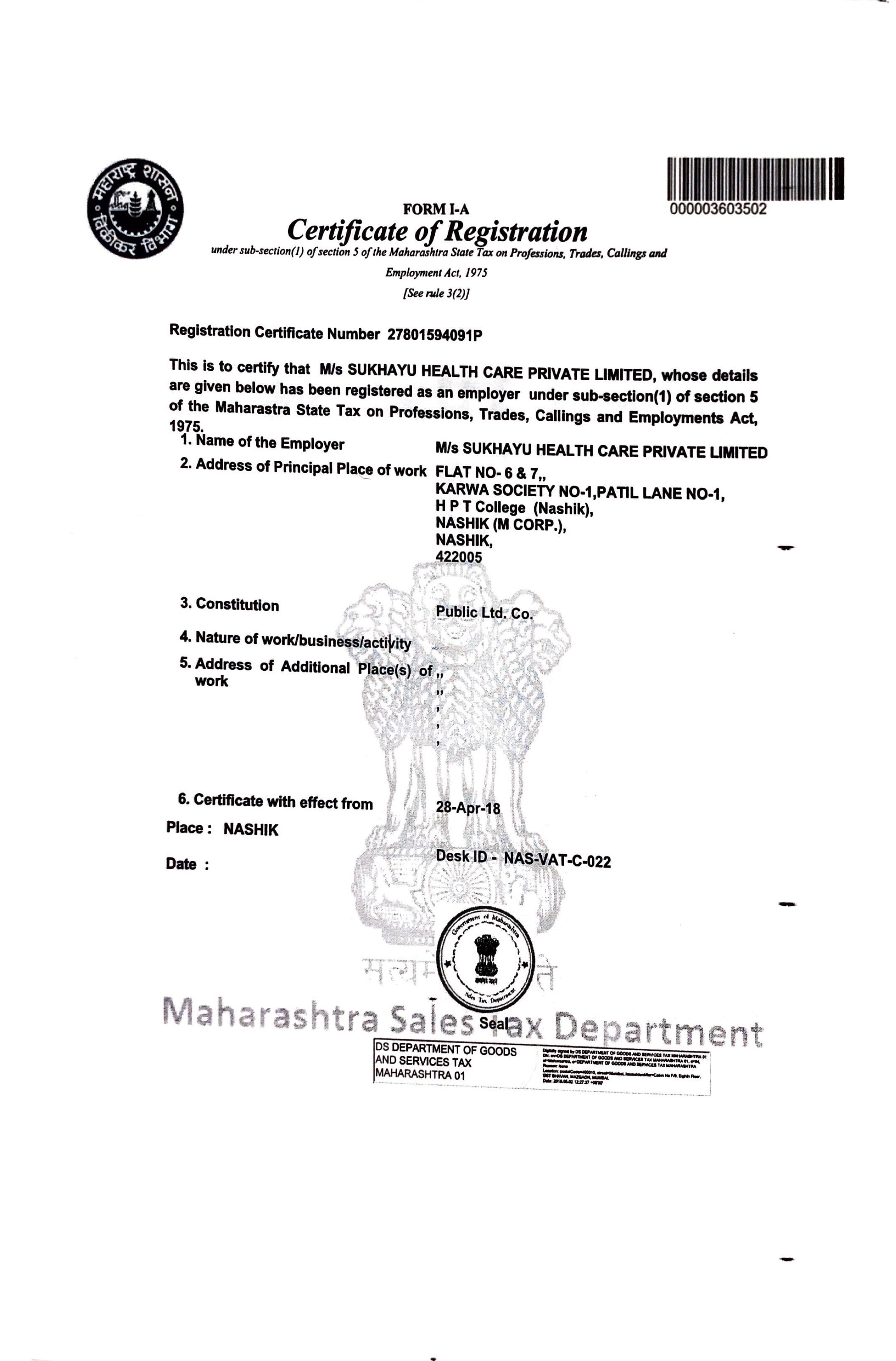 Profession Tax (PT) Registration Certificate of Sukhayu Healthcare Pvt Ltd